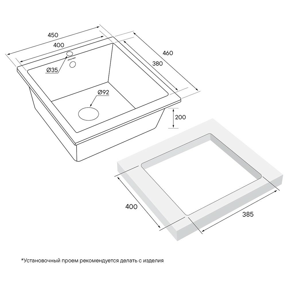 Мойка для кухни гранитная Paulmark GERA 50, 450х460 мм, монтаж: врезной / подстольный / вровень со столешницей, цвет графит, PM104546-DG