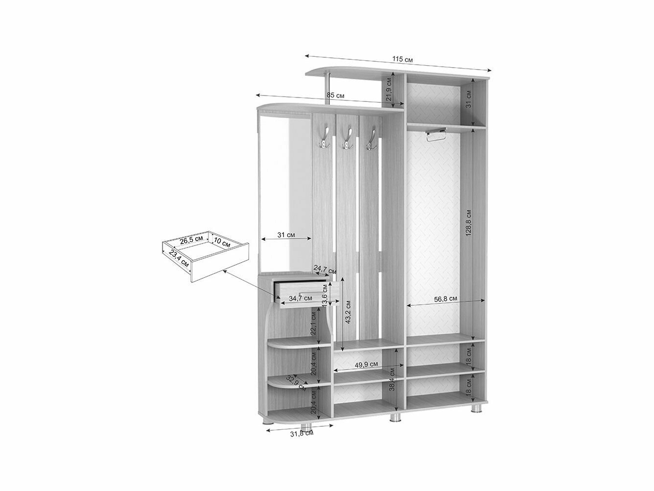 Прихожая комплект САША-6 (правая) от Фант-Мебель, с зеркалом, с обувницей, шкафом и ящиками, 156x203,6x43 см. Ясень темный/Ясень светлый