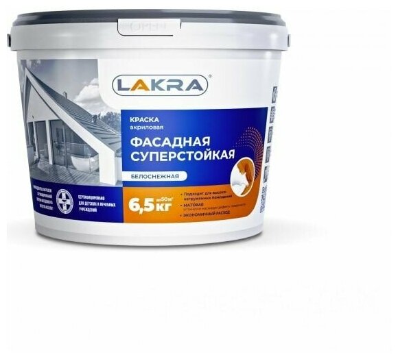 Краска Лакра. Акриловая Фасадная Суперстойкая Белоснежная, 6.5кг