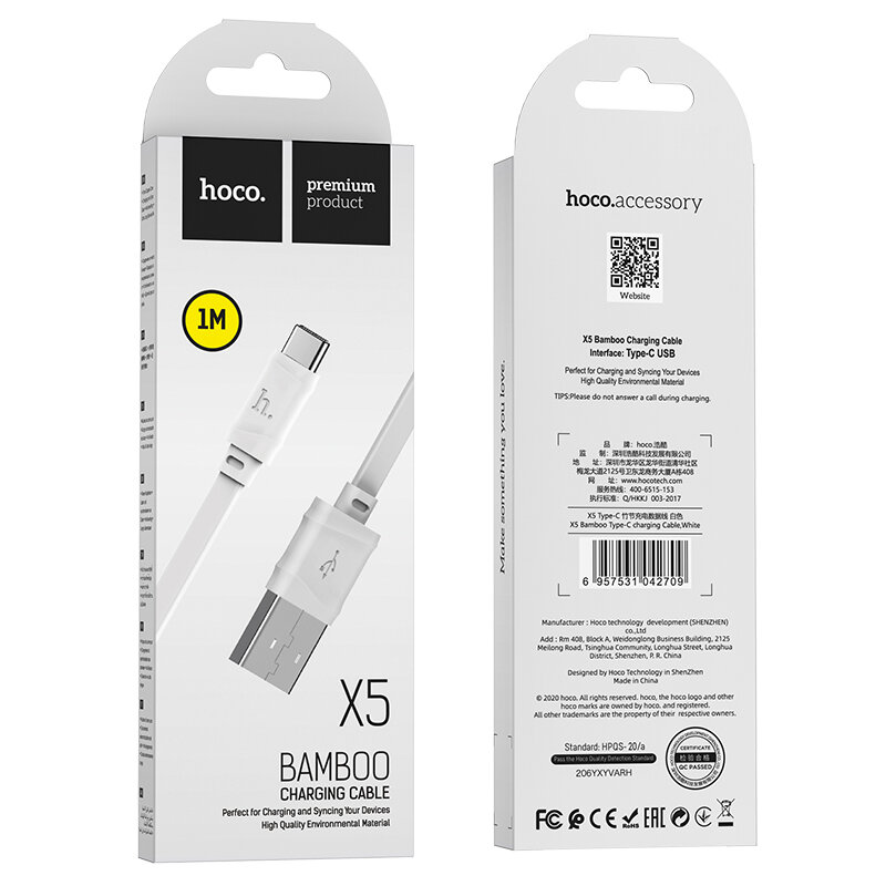 Кабель USB - Type-C HOCO X5 Bamboo, 1.0м, плоский, 2.1A, силикон, цвет белый