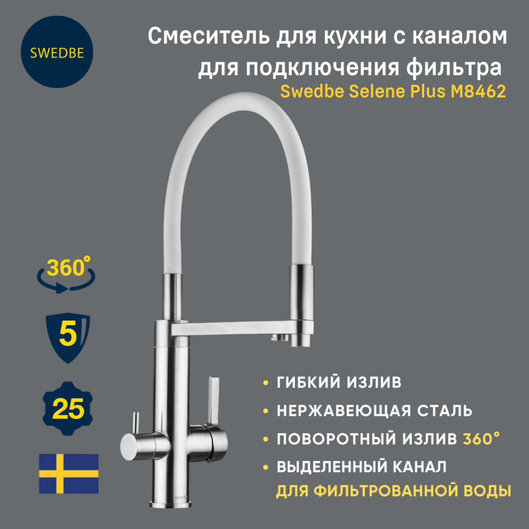 Смеситель для кухни Swedbe Selene Plus 8441 гибкий излив, канал для фильтр. воды, нерж.сталь/белый
