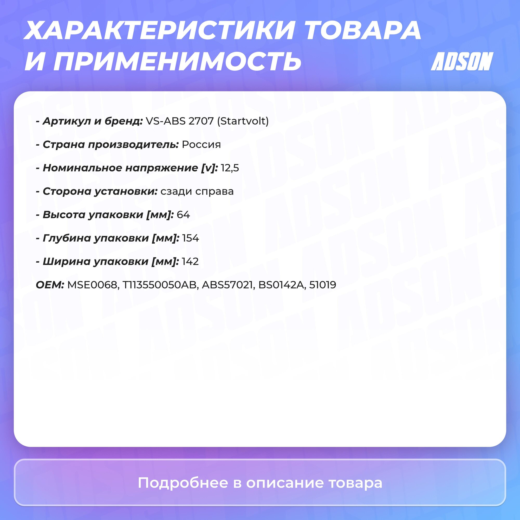 Датчик Abs Задний R Старт Вольт Vs-Abs 2707 STARTVOLT арт. VS-ABS 2707