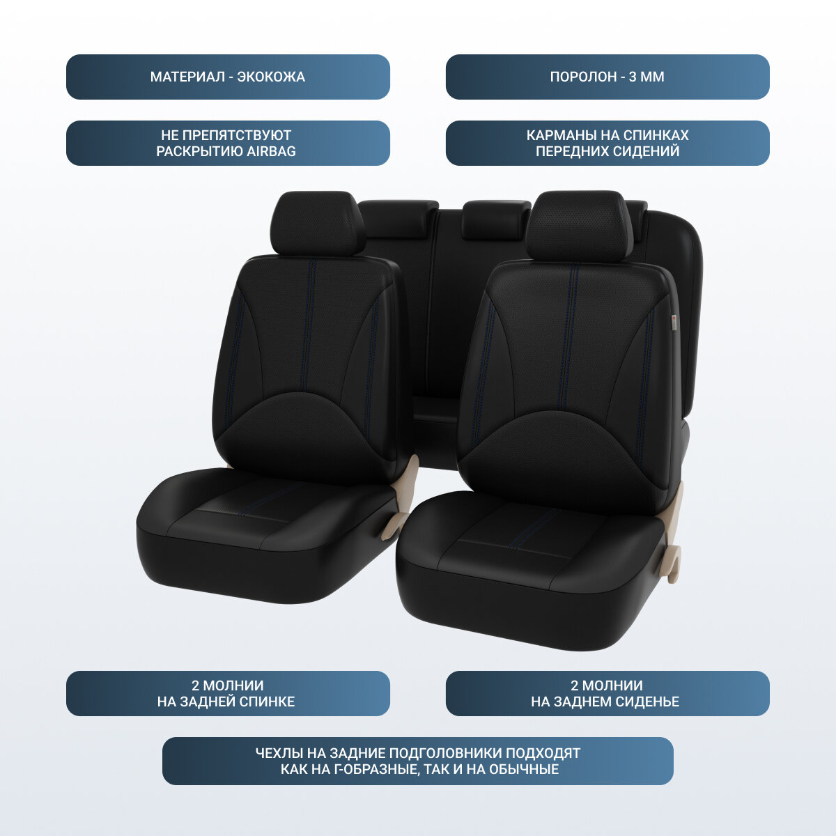 Авточехлы универсальные из экокожи черные с синим PSV Imperial Next, для автомобильных сидений комплект на весь салон, 11 предметов