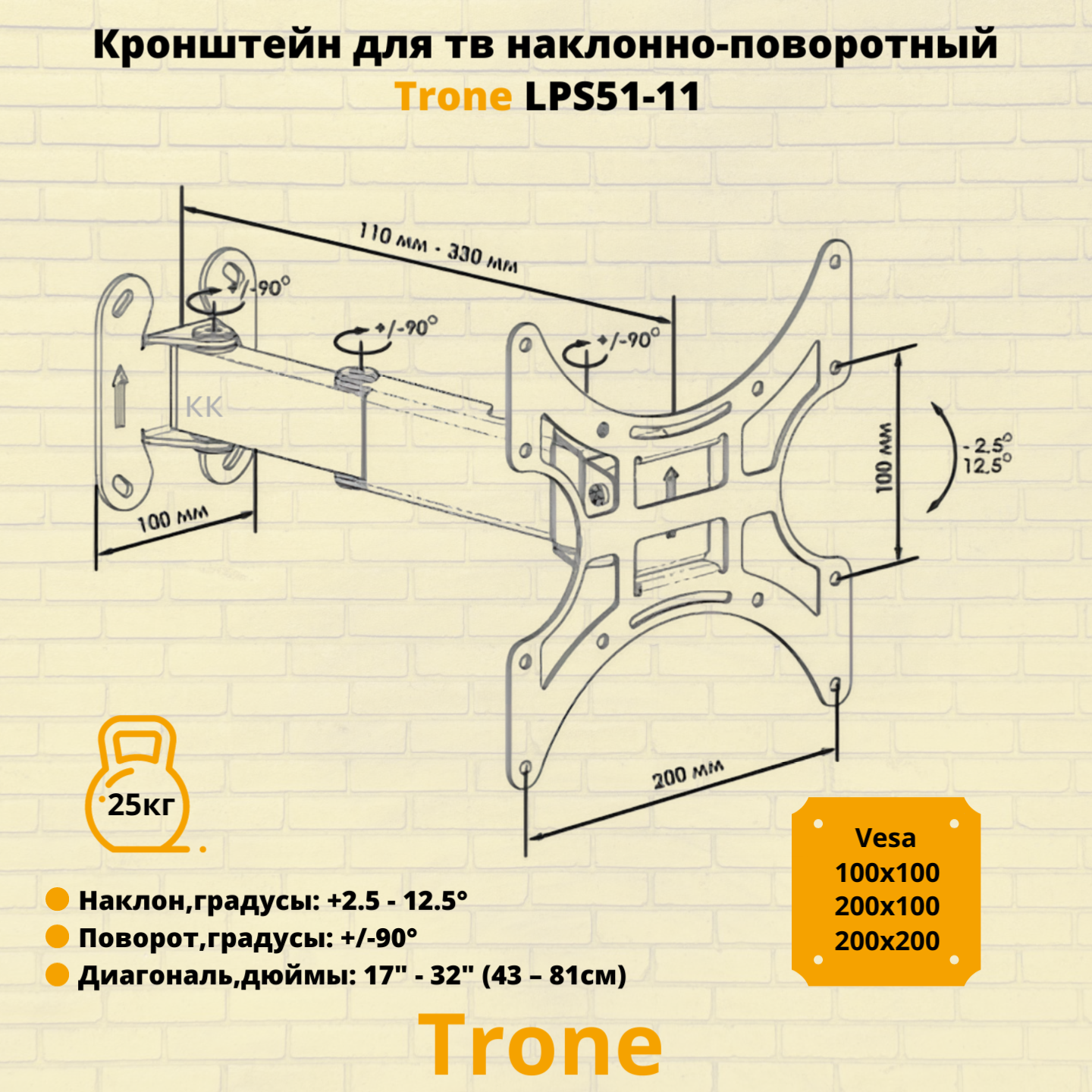 Кронштейн для телевизора на стену наклонно-поворотный с диагональю 17"-32" Trone LPS 51-11,черный
