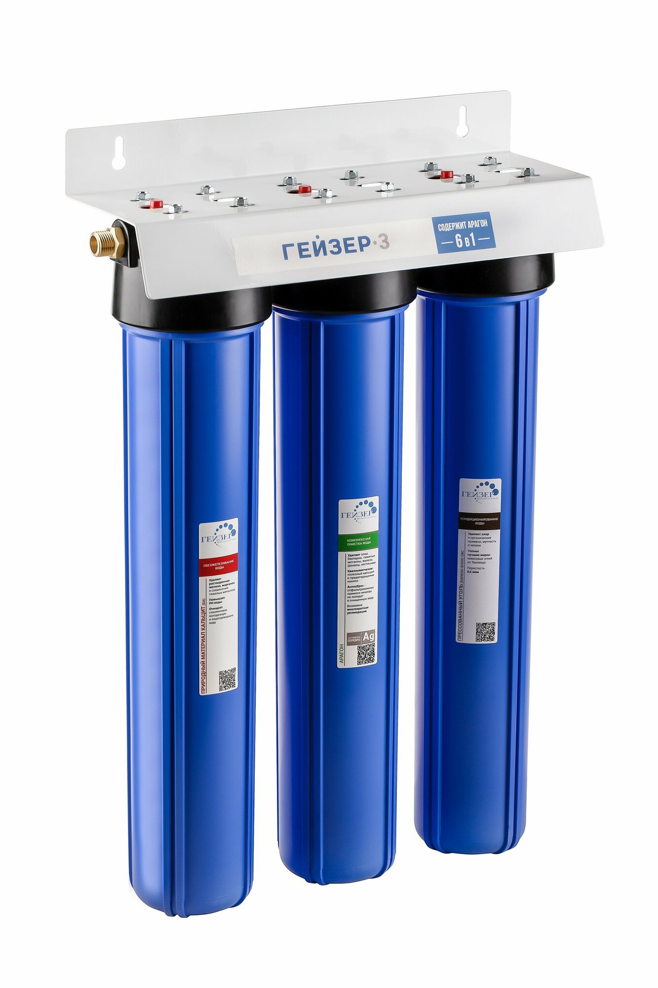 | Дополнительная информация | используемые в фильтрах картриджи из материала "Гейзер" могут быть в двух вариантах - для "мягкой" и "жесткой" воды; макс. температура воды на входе: 40 °C; мин. давление на входе: 0.5 атм; рекомендуемая производительность: 5 л/мин |