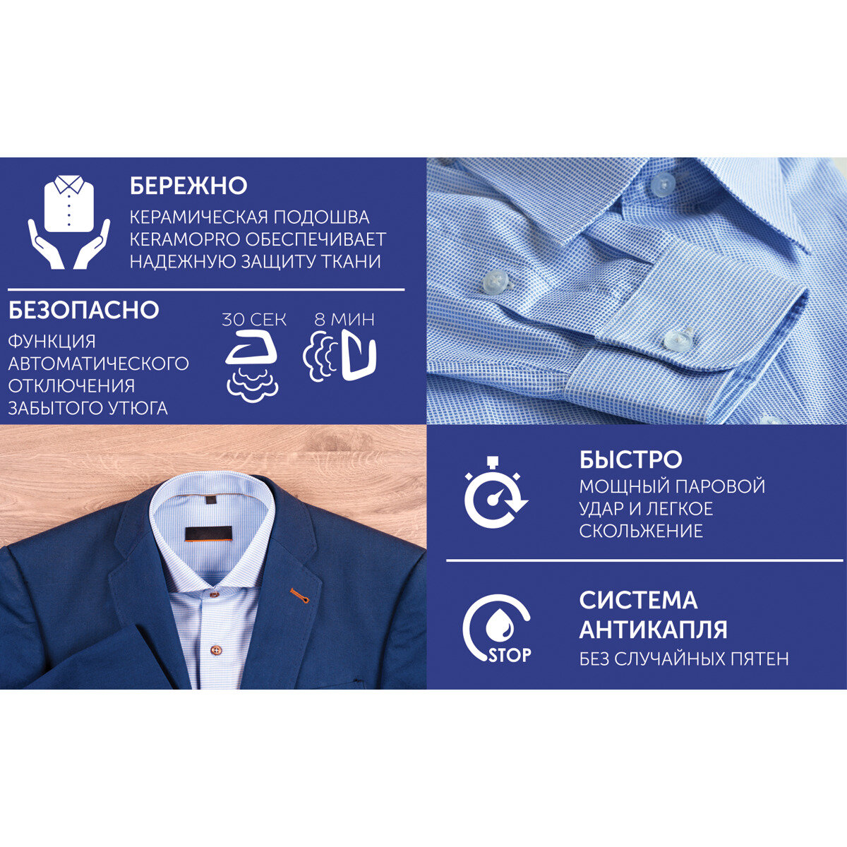 строгий стиль, плавное скольжение, мощный паровой удар, функция автоотключения, шнур защищён от перекручивания.
