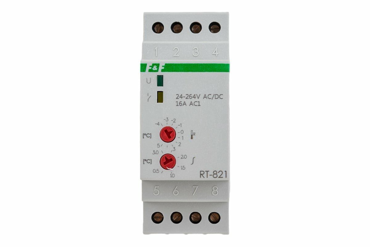 Регулятор температуры F&F RT-821 напряжение питания 50-264 В АС/DC, Диапазон от -4 до +5 гр., Контакт 1NO/NC, Максимальный ток 16 А.