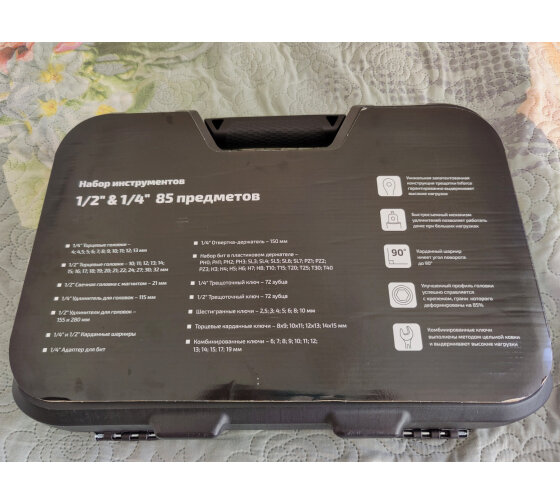 | Дополнительная информация | комплектация: 1/4" торцевые головки; 1/2" торцевые головки; 1/2" свечная головка с магнитом – 21 мм.; 1/4" удлинитель для головок – 115 мм.; 1/2" удлинители для головок – 155 и 280 мм.; 1/4" и 1/2"" карданные шарниры; 1/4" адаптер для бит; набор бит в пластиковом держателе; 1/4" отвертка-держатель – 150 мм; 1/4" трещоточный ключ; 1/2" трещоточный ключ; набор шестигранных ключей.; торцевые карданные ключи ; комбинированные ключи; кейс |