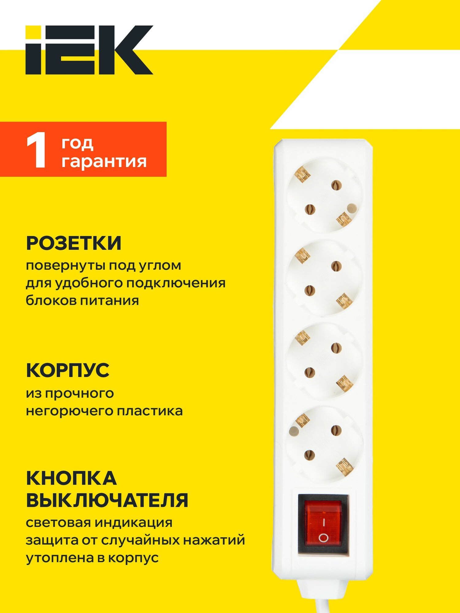 Удлинитель с выключателем IEK У04К-выкл, ПВС 3 x 1 мм², с заземлением, 4 розетки, 5 м, белый