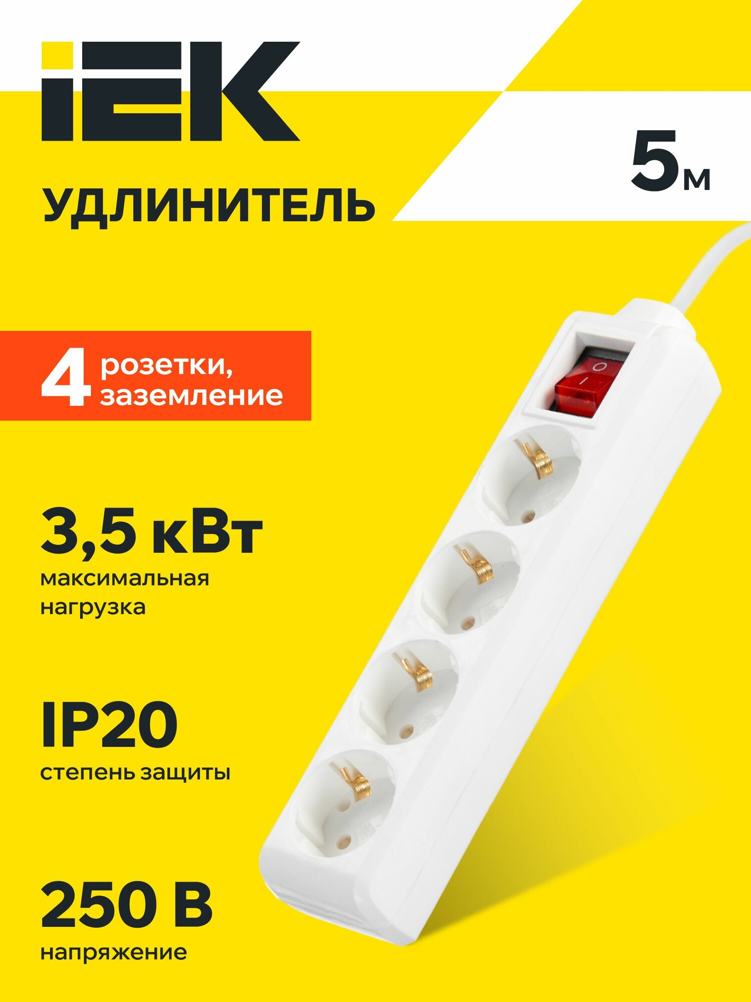 Удлинитель IEK WYP10-16-04-05-ZK-N, 4 розетки, 5 м, с/з, 16А / 3500 Вт белый