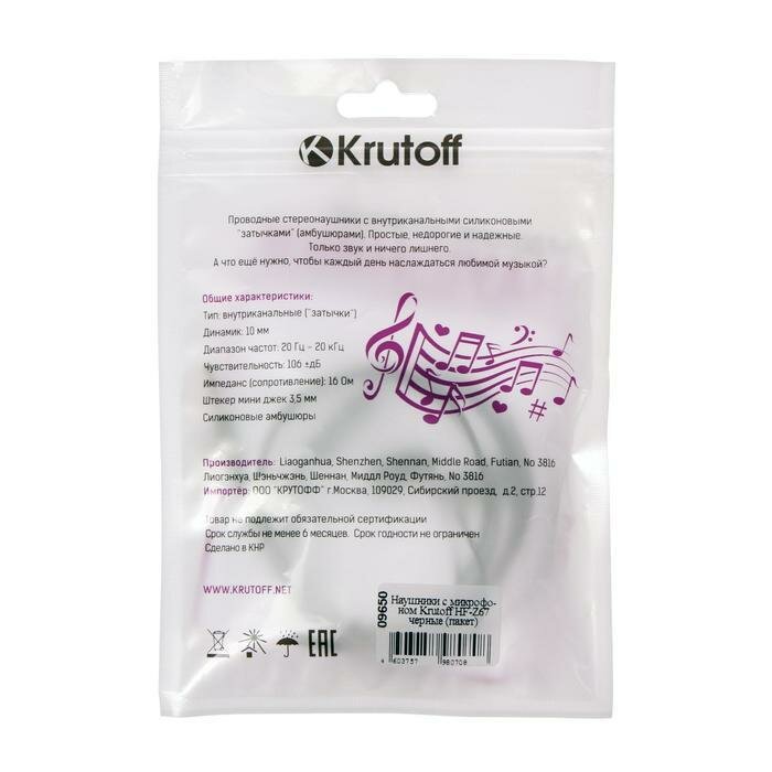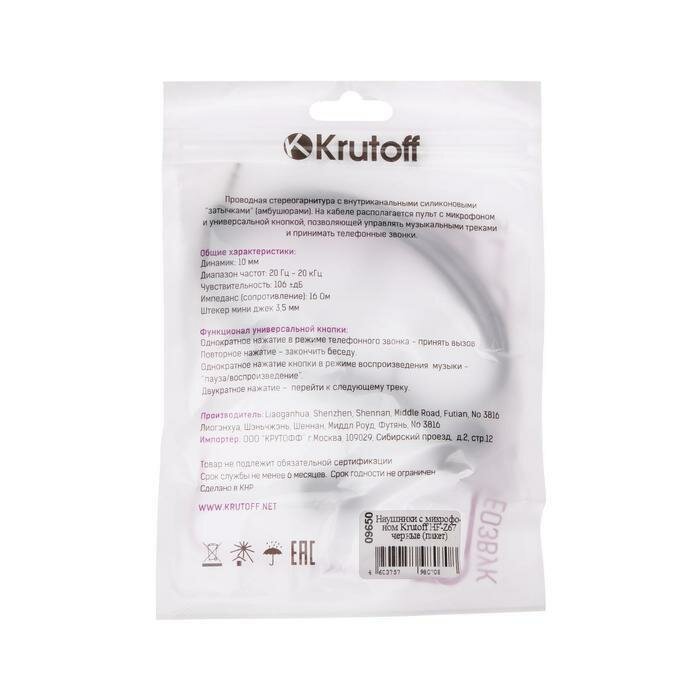 Наушники Krutoff HF-Z67, вакуумные, микрофон, 106 дБ, 16 Ом, 1 м, черные Krutoff 5141235 .
