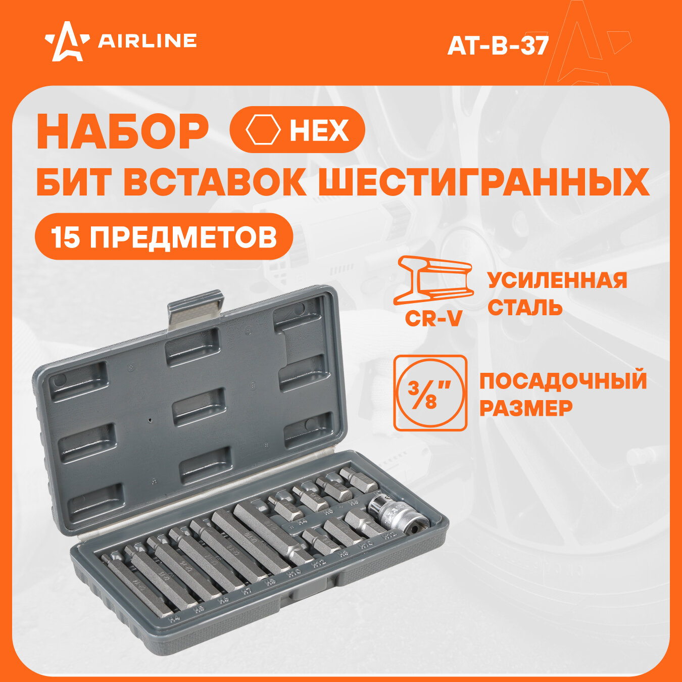 Наб.бит Вставок Шестигранных 3/8" 30Мм,75Мм С Держат.бит 1/2"Dr 15 Пред. В Кейсе_ме AIRLINE арт. AT-B-37