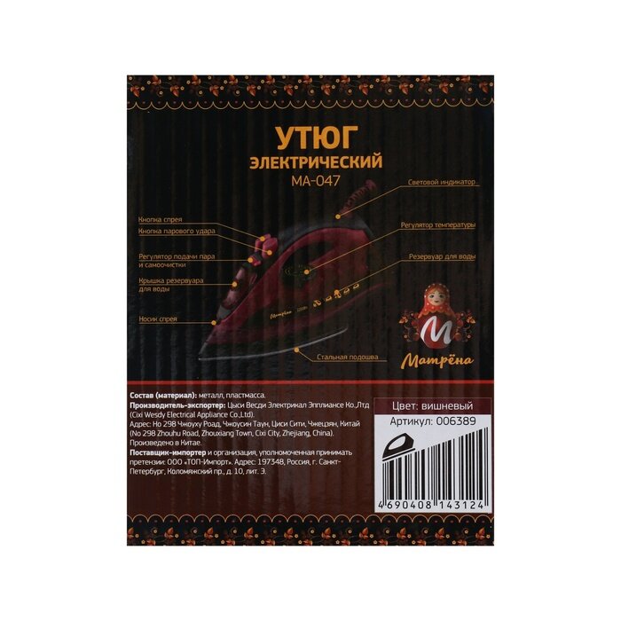 СохранитьУтюг Матрёна MA-047 вишневый (2200Вт, пар, спрей, пар.удар, самооч., стальная подошва) интересное: