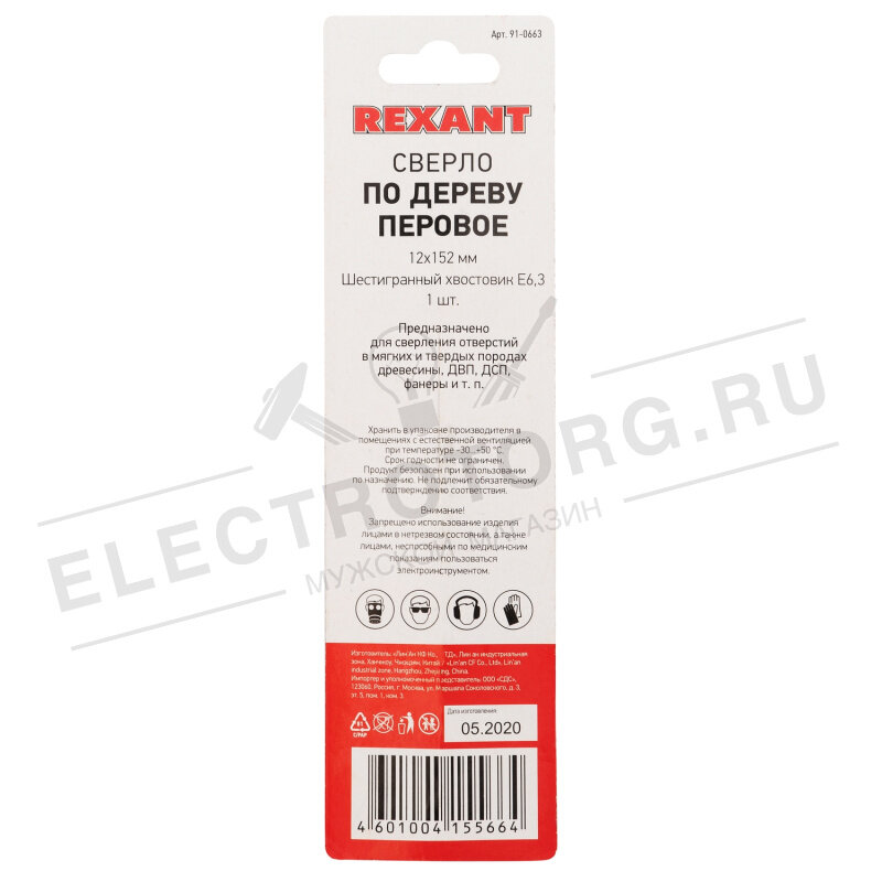 Сверло перовое по дереву 12х152 мм (шестигранный хвостовик) REXANT Артикул 91-0663
