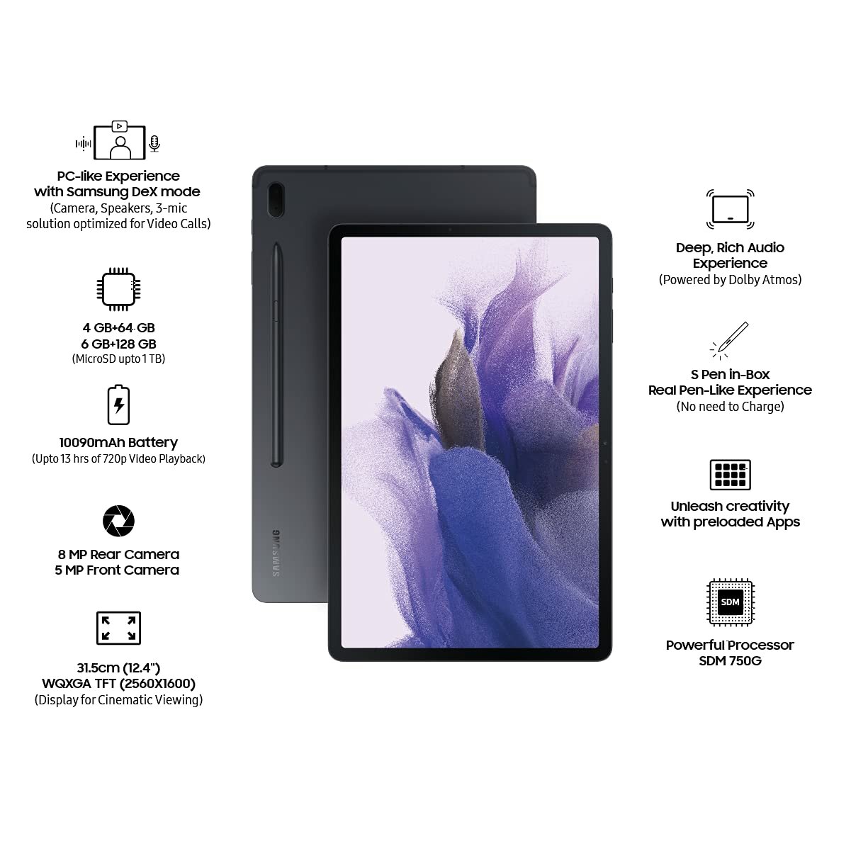 Samsung Galaxy Tab S7 FE 12.4 SM-T735N (2021) RU, 6 ГБ/128 ГБ, Wi-Fi + Cellular, со стилусом, черный