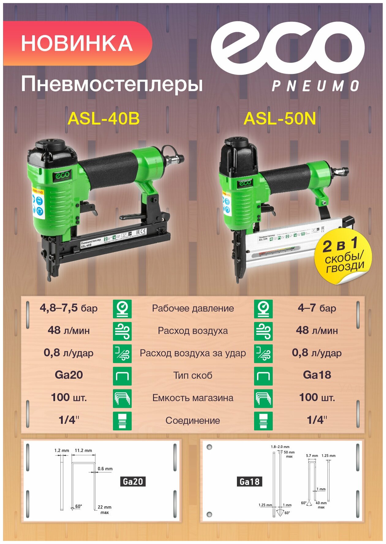 Ниже Вы можете прочитать отзывы на Пневмостеплер ECO ASL-50N (гвозди/скобы 18GA, 4-7 бар, 0.8 л/удар, гвоздь 50 мм макс, скоба 40 мм макс, магазин 100 шт), ознакомится с подробными характеристиками, посмотреть интересные обзоры и фотографии на Пневмостеплер ECO ASL-50N (гвозди/скобы 18GA, 4-7 бар, 0.8 л/удар, гвоздь 50 мм макс, скоба 40 мм макс, магазин 100 шт).