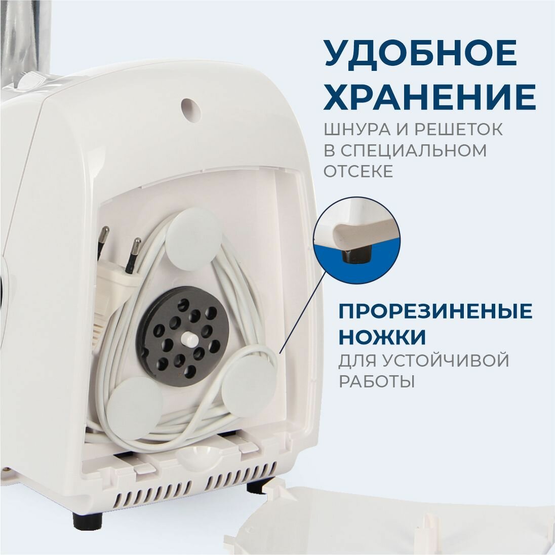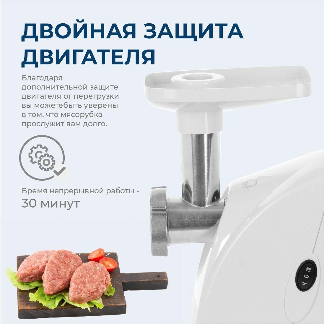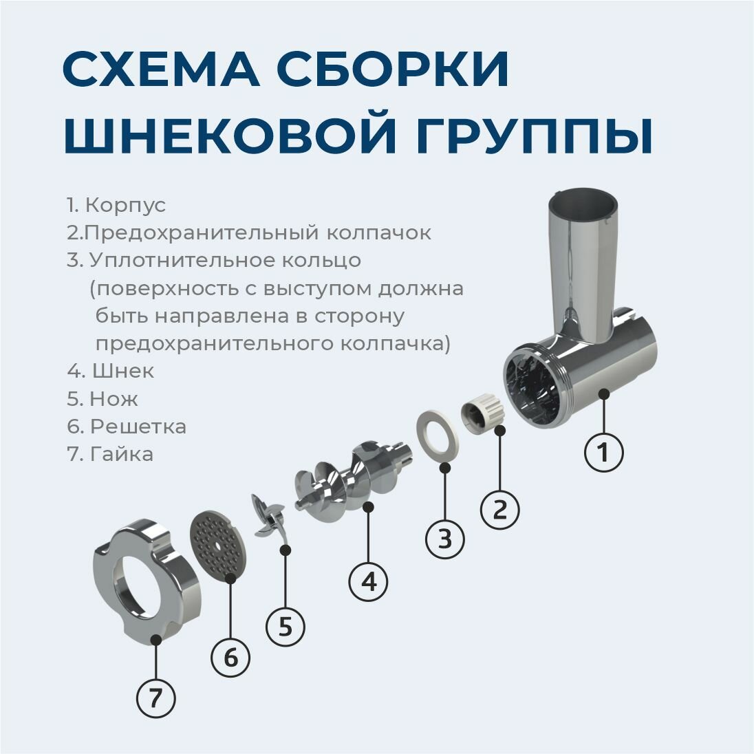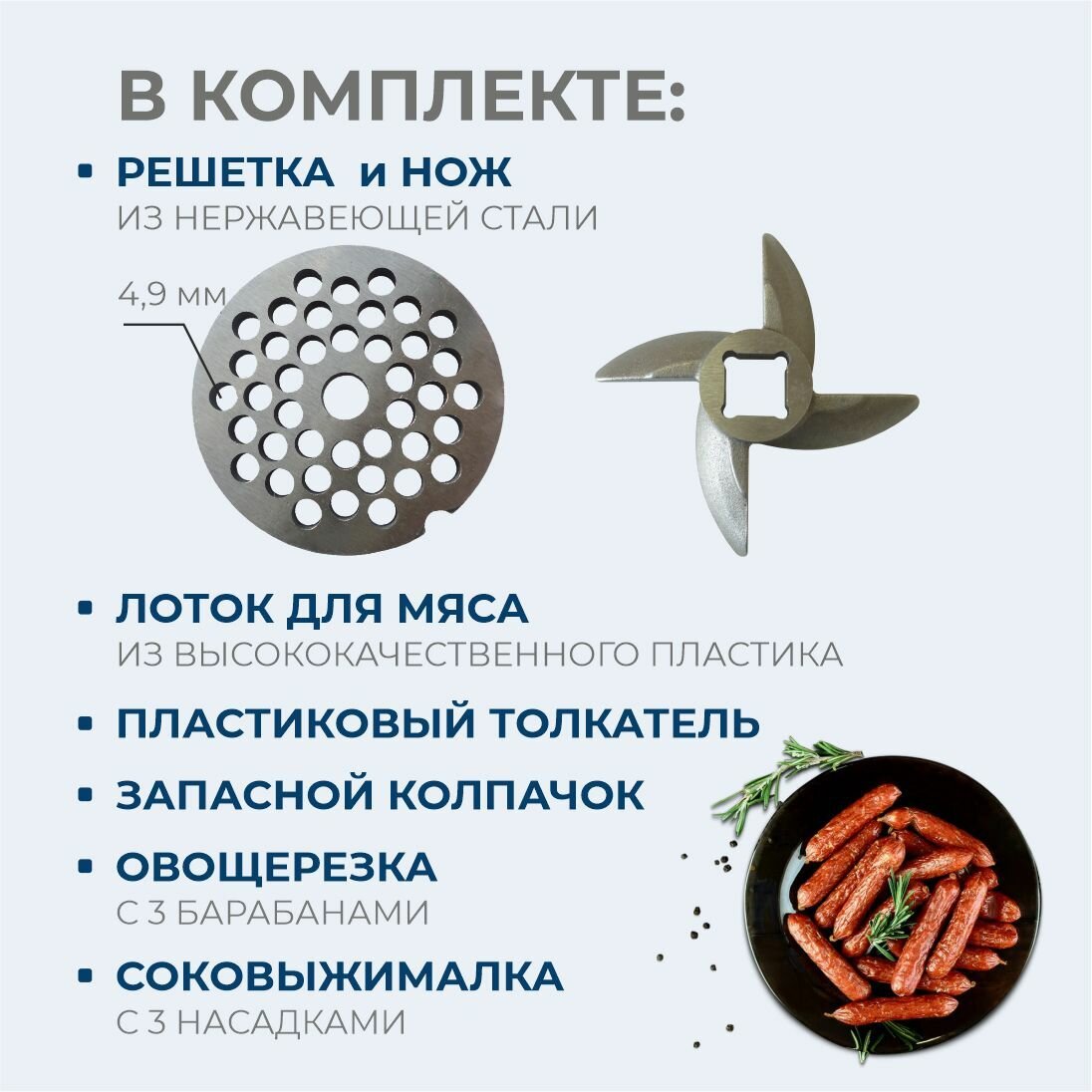 | Комплектация | мясорубка 1 шт, насадка-овощерезка 1 шт, насадка-соковыжималка 1 шт, решётка для фарша 5 мм 1 шт, запасной предохранительный колпачок 1 шт |