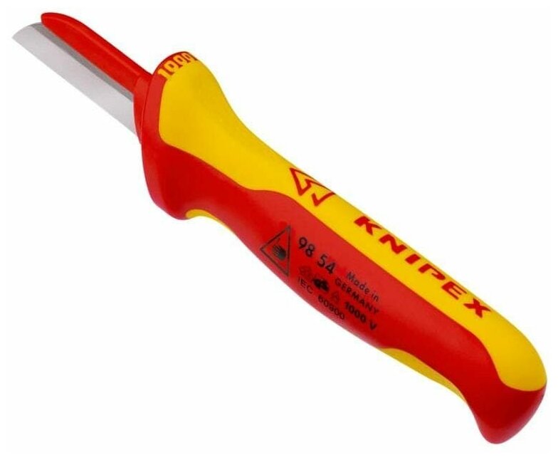 Купить Нож для снятия изоляции KNIPEX KN-9854 для кабеля VDE, пласт.защитный обух, 190 мм, 2-комп диэлектр. ручка