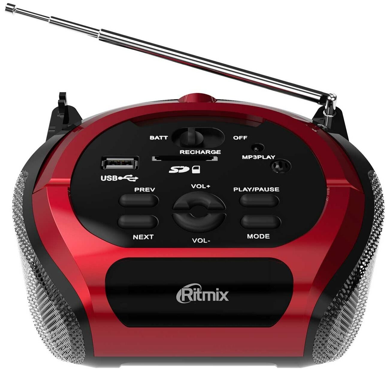 Магнитола RITMIX RBB-100BT red,3Вт*2,Bt,FM, телескоп.ант.,воспр.с USB/SD,формат:MP3,AUX, встр.Аккум.3,7В1200мАч