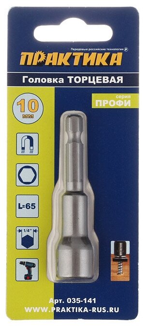 Головка гайковерта "Профи" магнитная 10 х 65 мм с хвостовиком HEX 1/4" (1шт) ПРАКТИКА 035-141