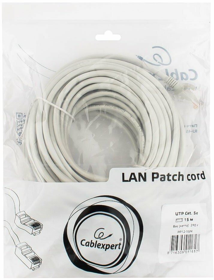 Кабель (патч-корд) UTP 5e кат. RJ-45 15м Cablexpert, для подключения по локальной сети LAN, PP12-15M