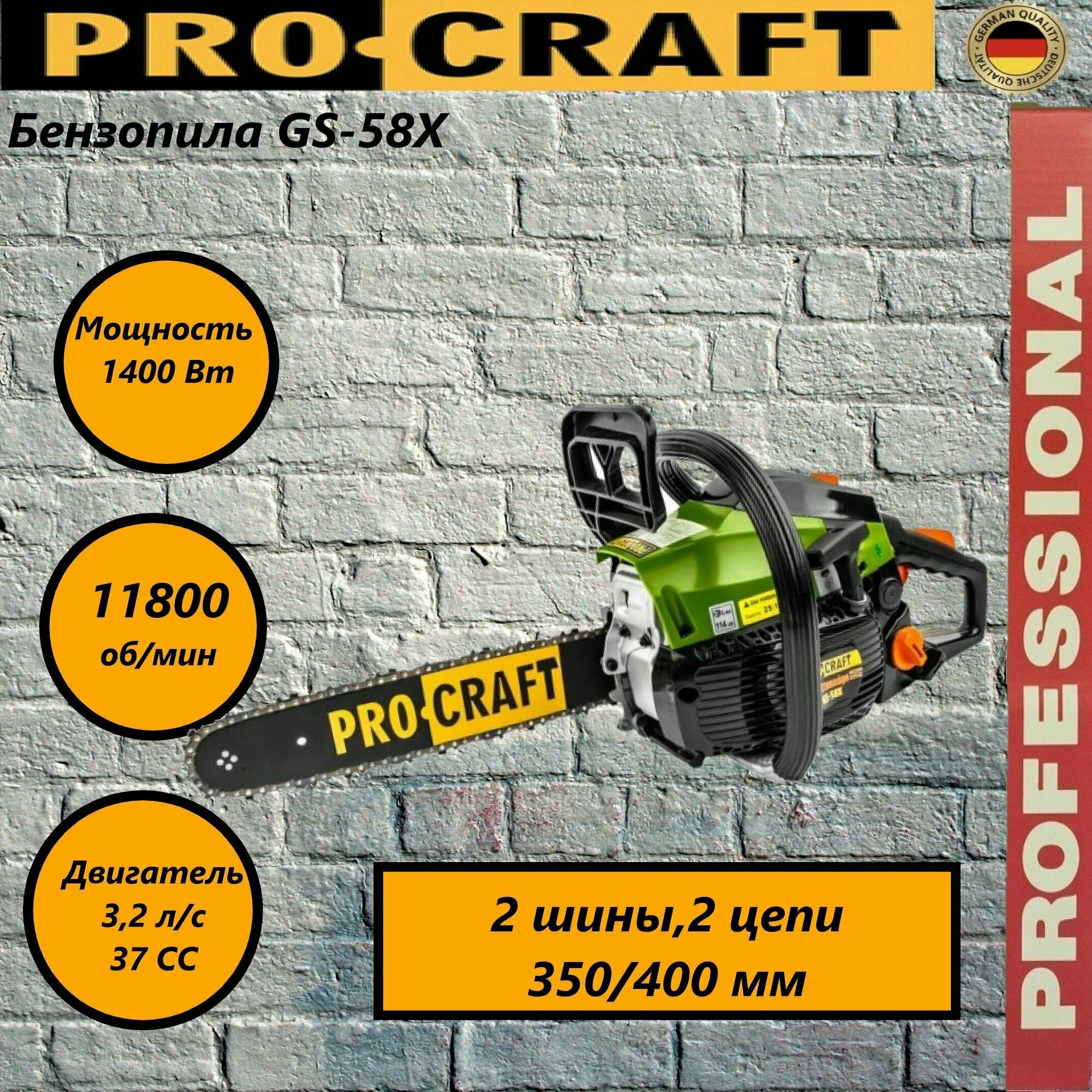 Пила цепная бензиновая Procraft GS-58 X (2 шины 350/400мм, 2 цепи), 3.2 л/с, 1400Вт, 11500 об/мин