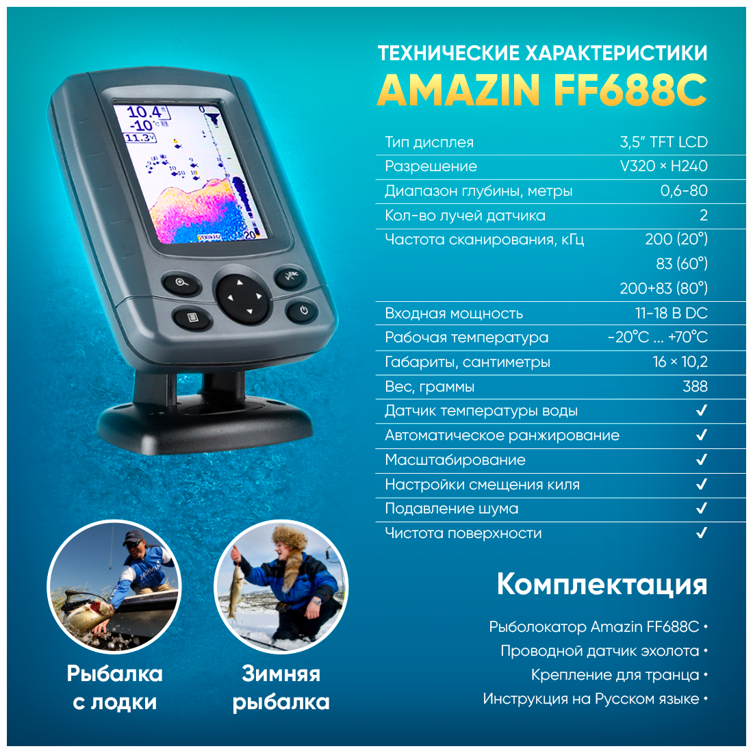 Эхолот Amazin Fish Finder 688 C для лодки проводной двухлучевой