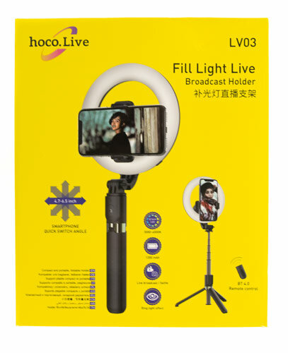Кольцевая лампа HOCO LV03 Showfull 3000-6500K, 0.92м, d=160.5мм, BT пульт, встр. АКБ, 1 держат, черный