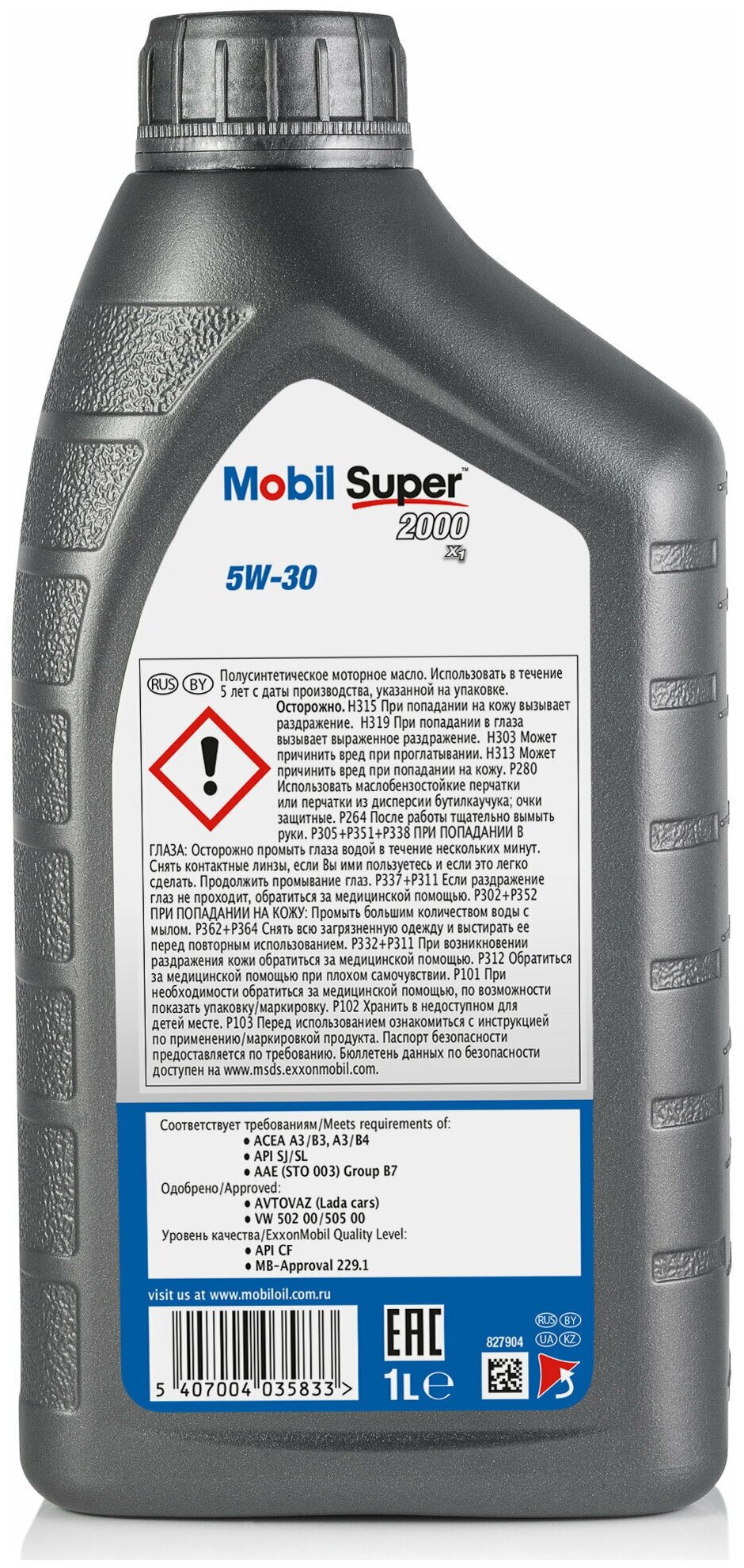 Масло моторное Mobil Super™ 2000 X1 5w30, полусинтетическое, API SL/CF, ACEA A3/B3/B4, универсальное, 1л, арт. 155184