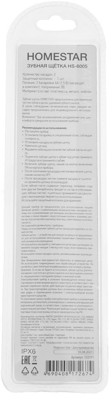 NINGBO JOYFUL INTERNATIONAL CO., LTD Зубная щетка электрическая Homestar HS-6005, с дополнительной насадкой, бело-синяя
