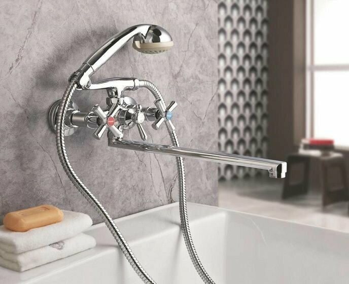 Смеситель для ванны с душем двухвентильный/ кран в ванную длинный излив Zegor DFR7-C722, цвет: хром интересное: