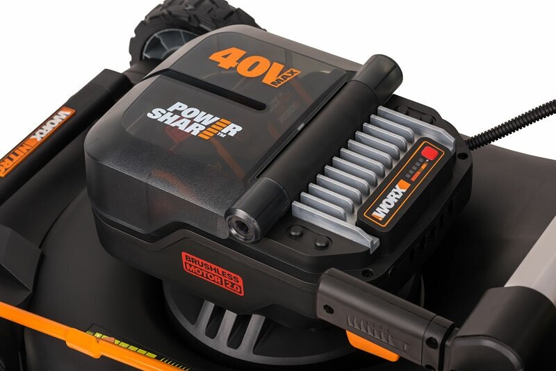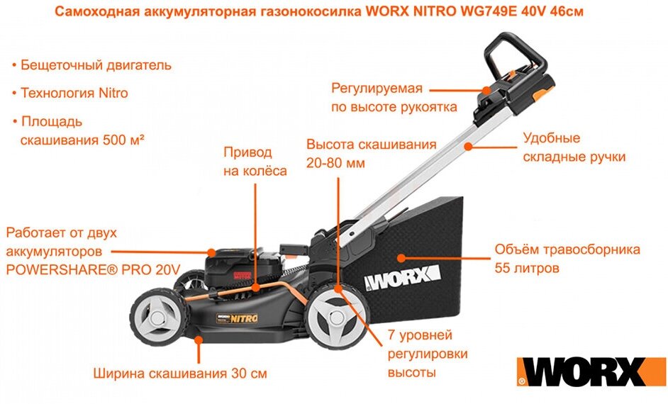 Газонокосилка аккумуляторная самоходная WORX 46 см NITRO WG749E, бесщеточная, 40В, 4Ач х2, ЗУ 2А х2,