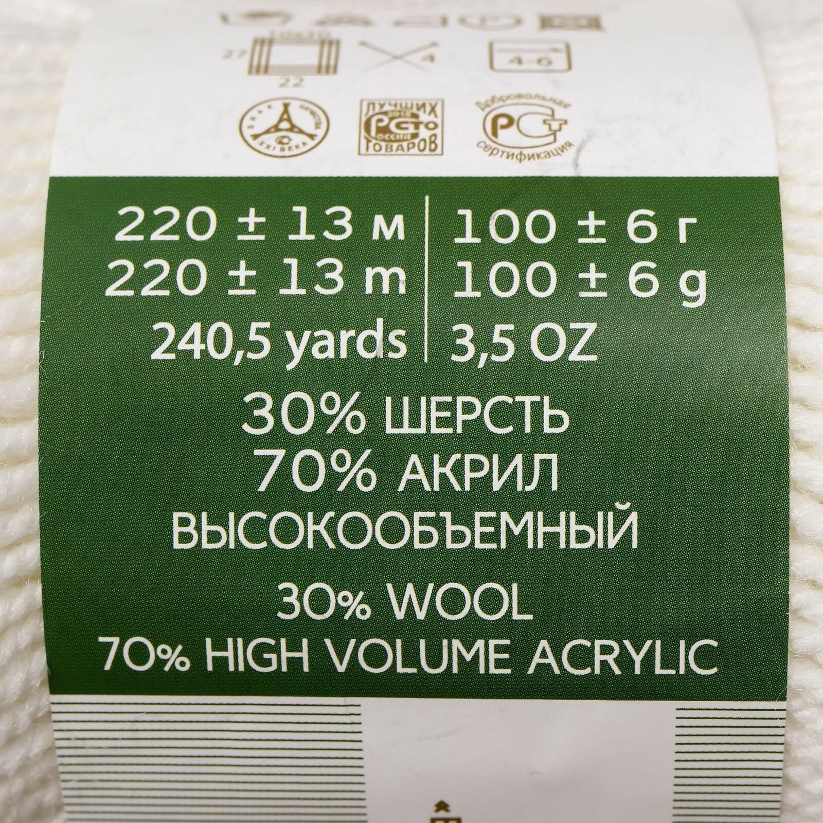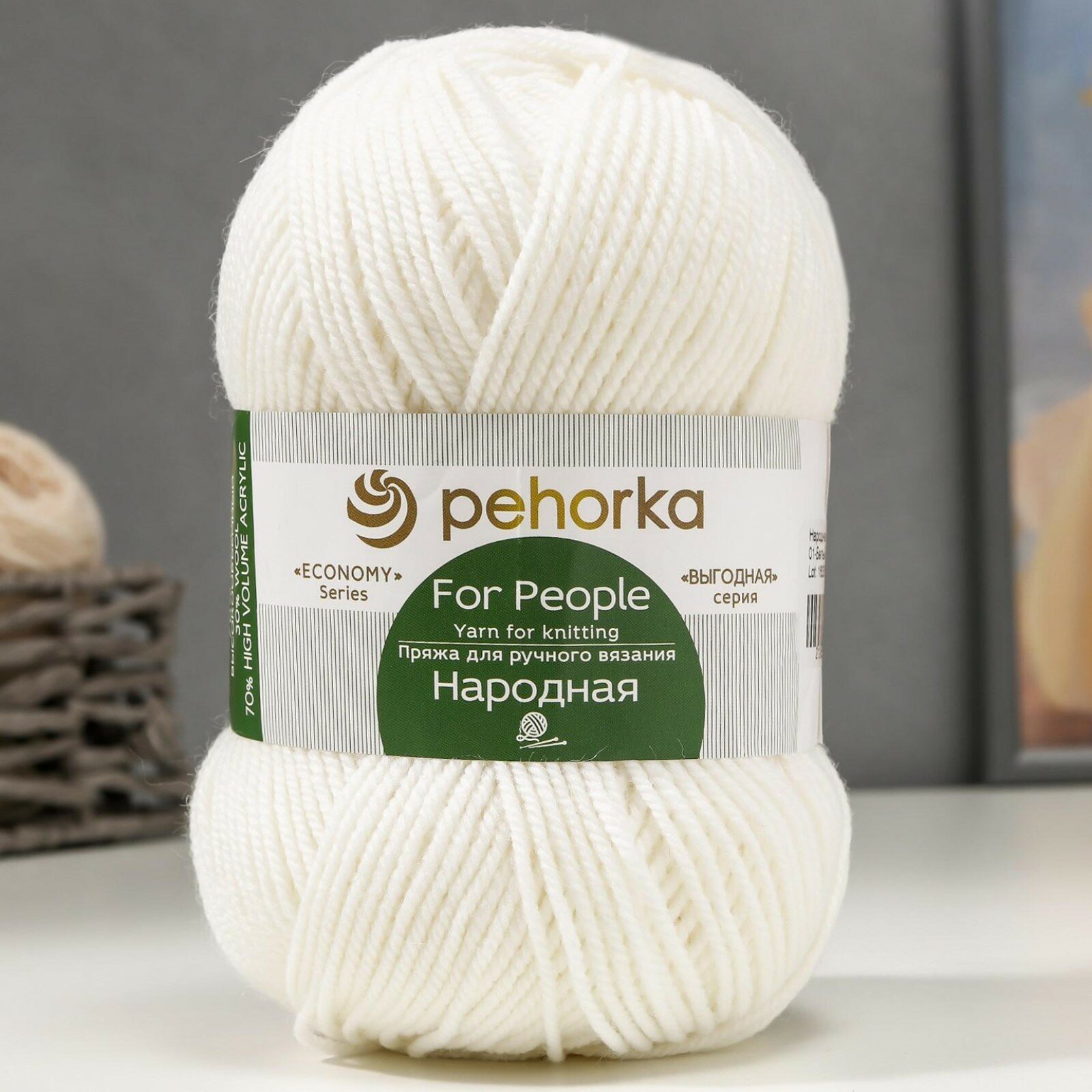 Пряжа для вязания Пехорка 'Народная', 100г, 220м (30% шерсть, 70% акрил высокообъемный) (01 белый), 5 мотков