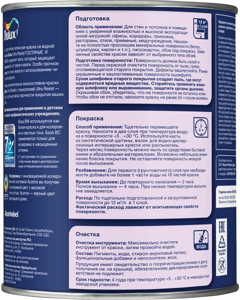 Краска Dulux Ultra Resist BW для гостиных и офисов (усилена воском), 2.5 л