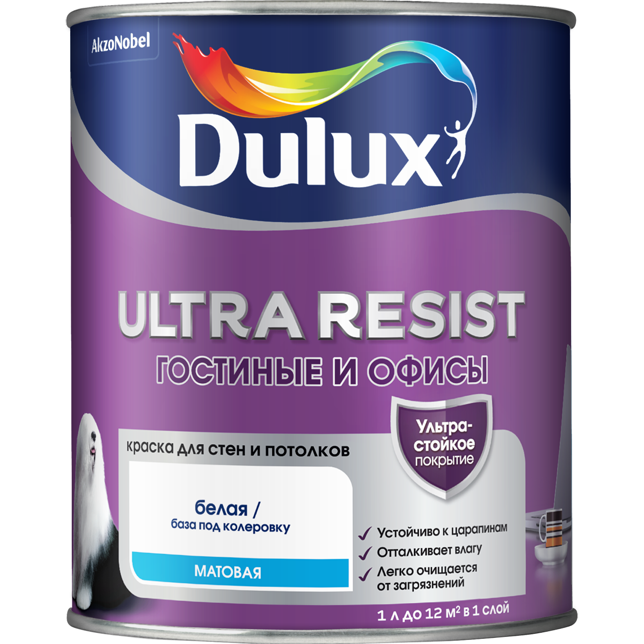 DULUX ULTRA RESIST гостиные И офисы краска интерьерная, усилена воском, матовая, база BW (1л)