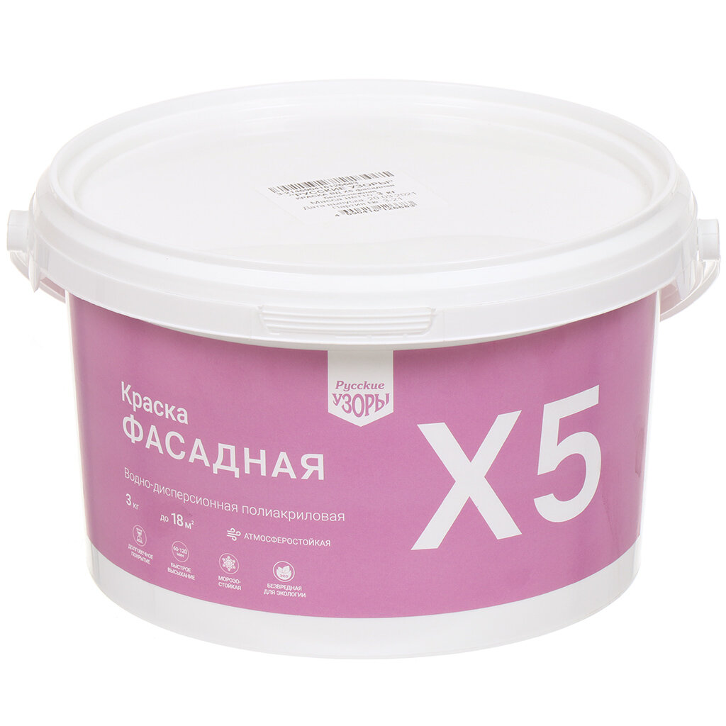 Купить Краска воднодисперсионная, Русские узоры, фасадная, матовая, белоснежная, 3 кг