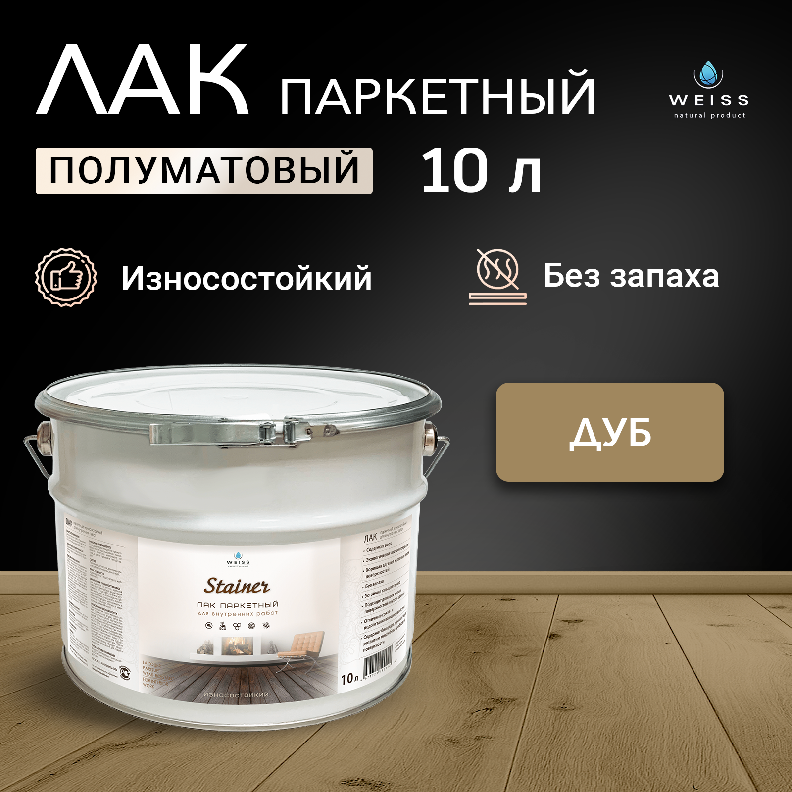 Лак строительный паркетный бесцветный полуматовый, для пола, для паркета, для стен, для мебели, для дерева Weiss natural product без запаха самовыравнивающийся 10л
