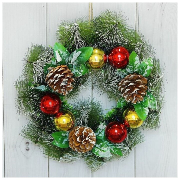 Купить Венок новогодний d-27 см "Шишки и листики в инее"