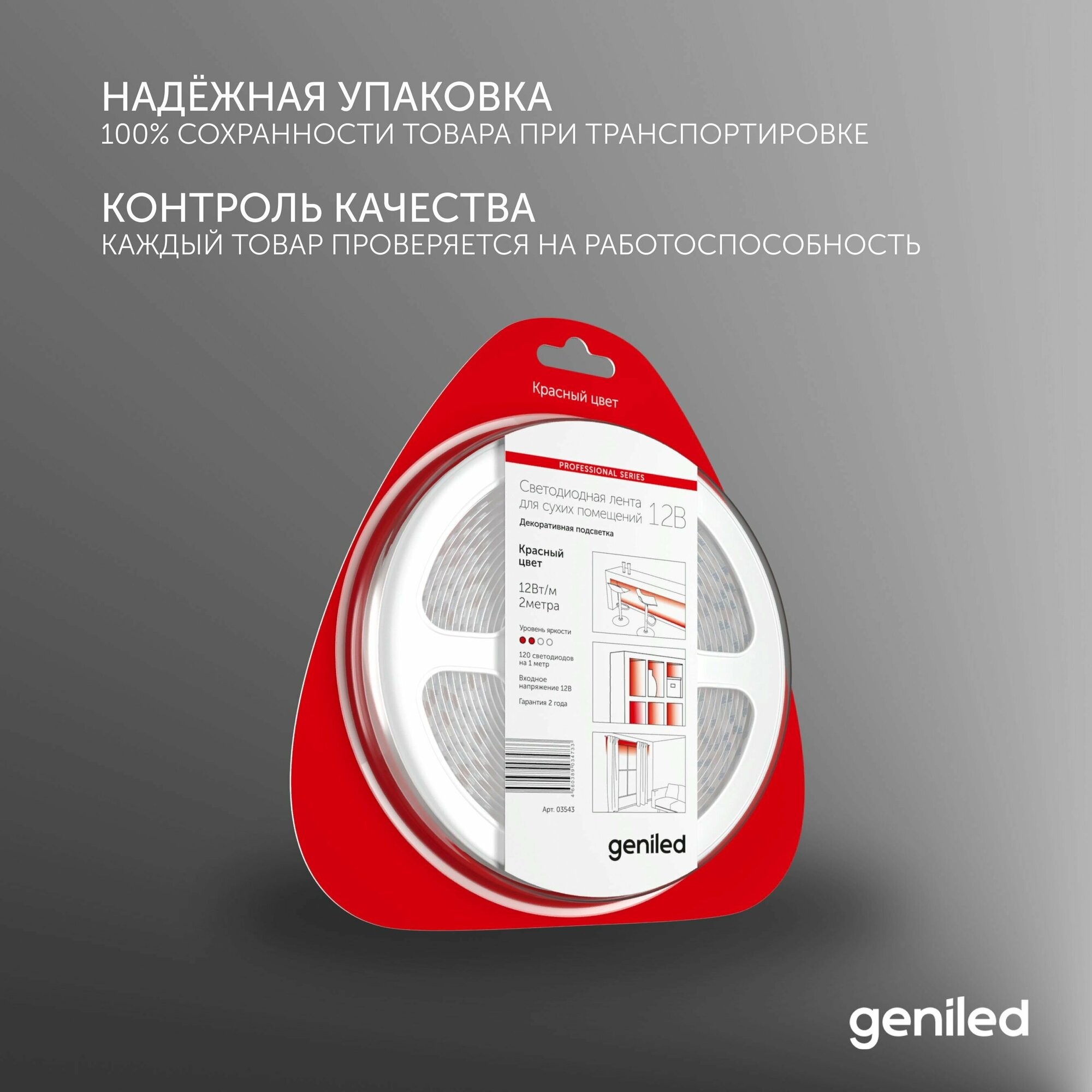 Светодиодная лента, подсветка Geniled - для комнаты, в гардероб, на кухню - Красный свет / GL-120SMD2835 / 12В / Длинна - 2м / B - 8 мм / W - 12Вт / Red / IP33