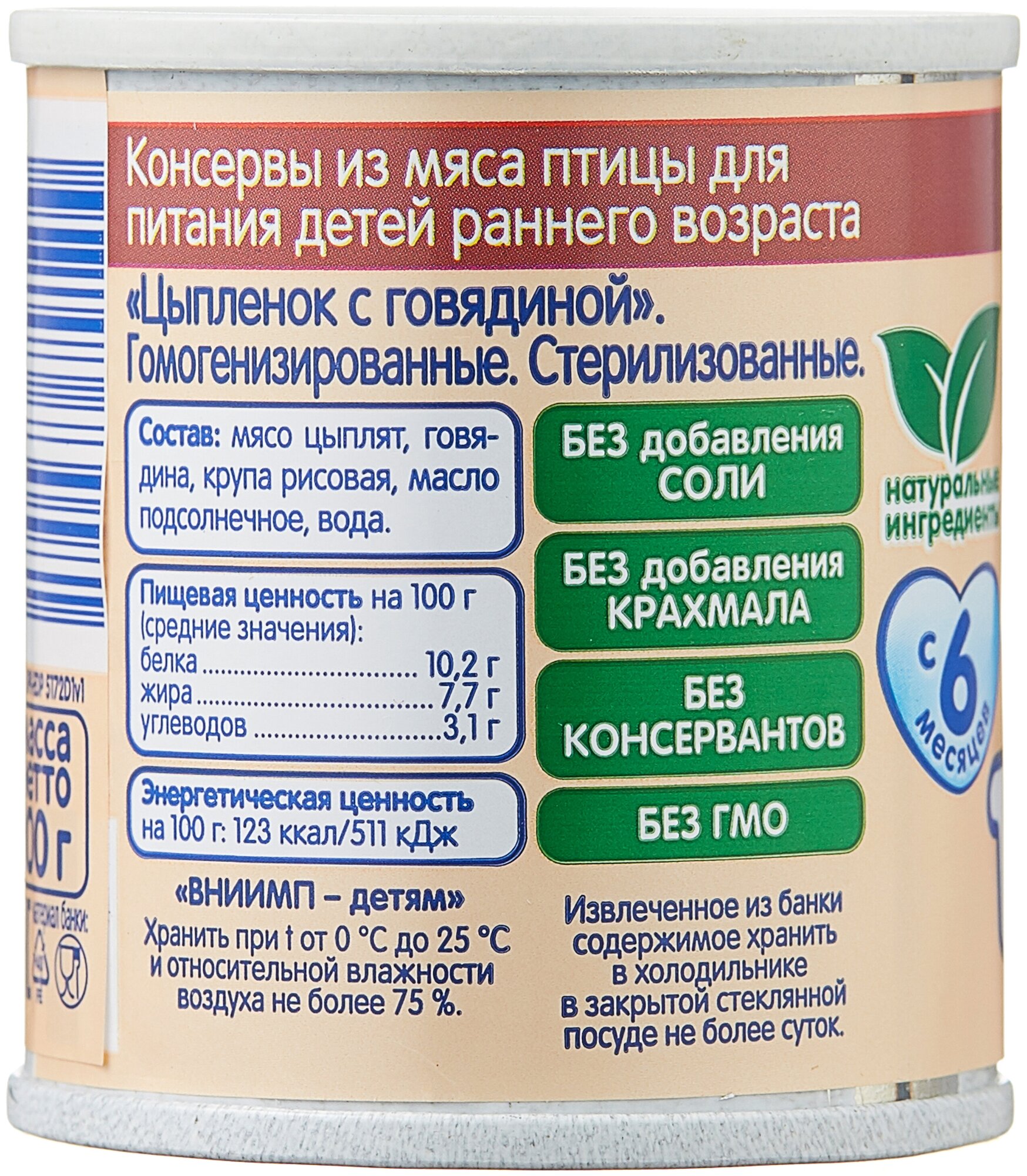 Больше цыпленка, чем говядины. Светлое, житковатое мясо в баночке.