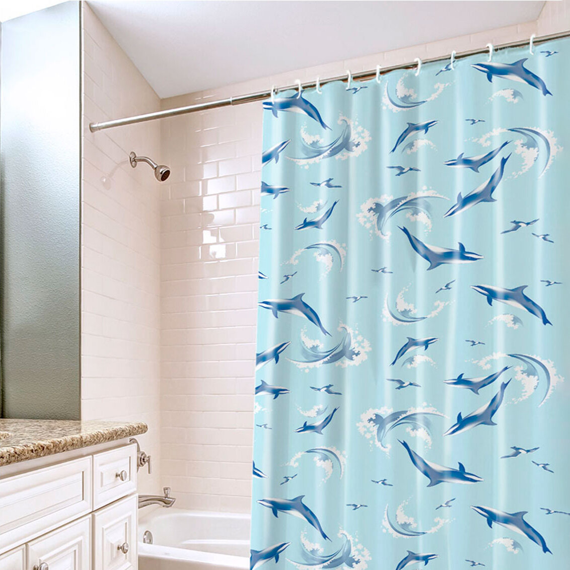 Штора для ванной комнаты VILINA водонепроницаемая с рисунком занавес с кольцами 180х180 см Дельфины зелёная
