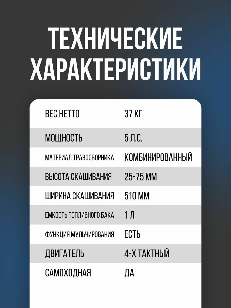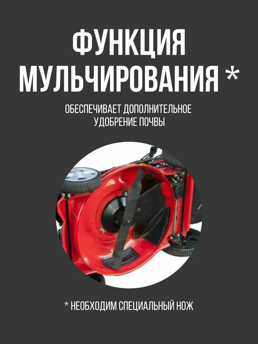 | Дополнительные функции | возможность установки мульчирующей насадки / регулировка высоты скашивания / тормоз двигателя / возможность промывки деки |