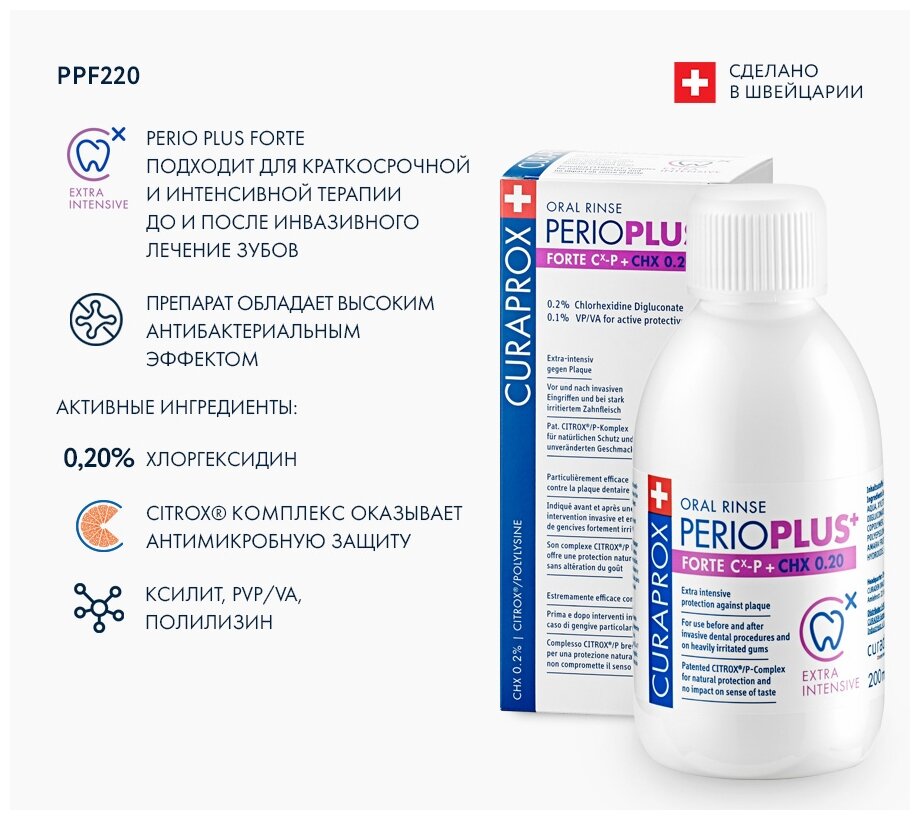 Жидкость - ополаскиватель CURAPROX Perio Plus Forte PPF220, с содержанием хлоргексидина 0,20%, (200 мл)