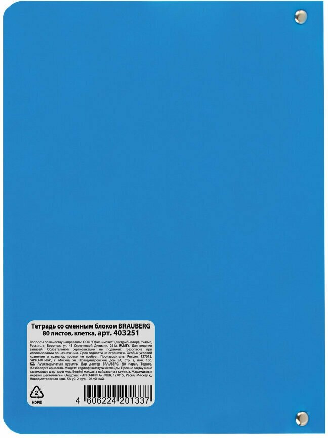 Тетрадь на кольцах А5 160х215 мм, 80 л., пластик, клетка, BRAUBERG, "Голубой", 403251 (цена за 1 ед.товара)