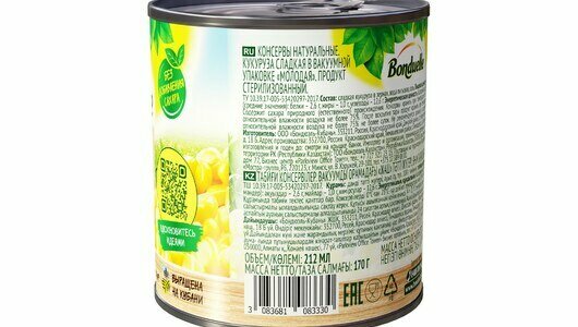 | Состав | сладкая кукуруза в зернах, вода питьевая, соль |