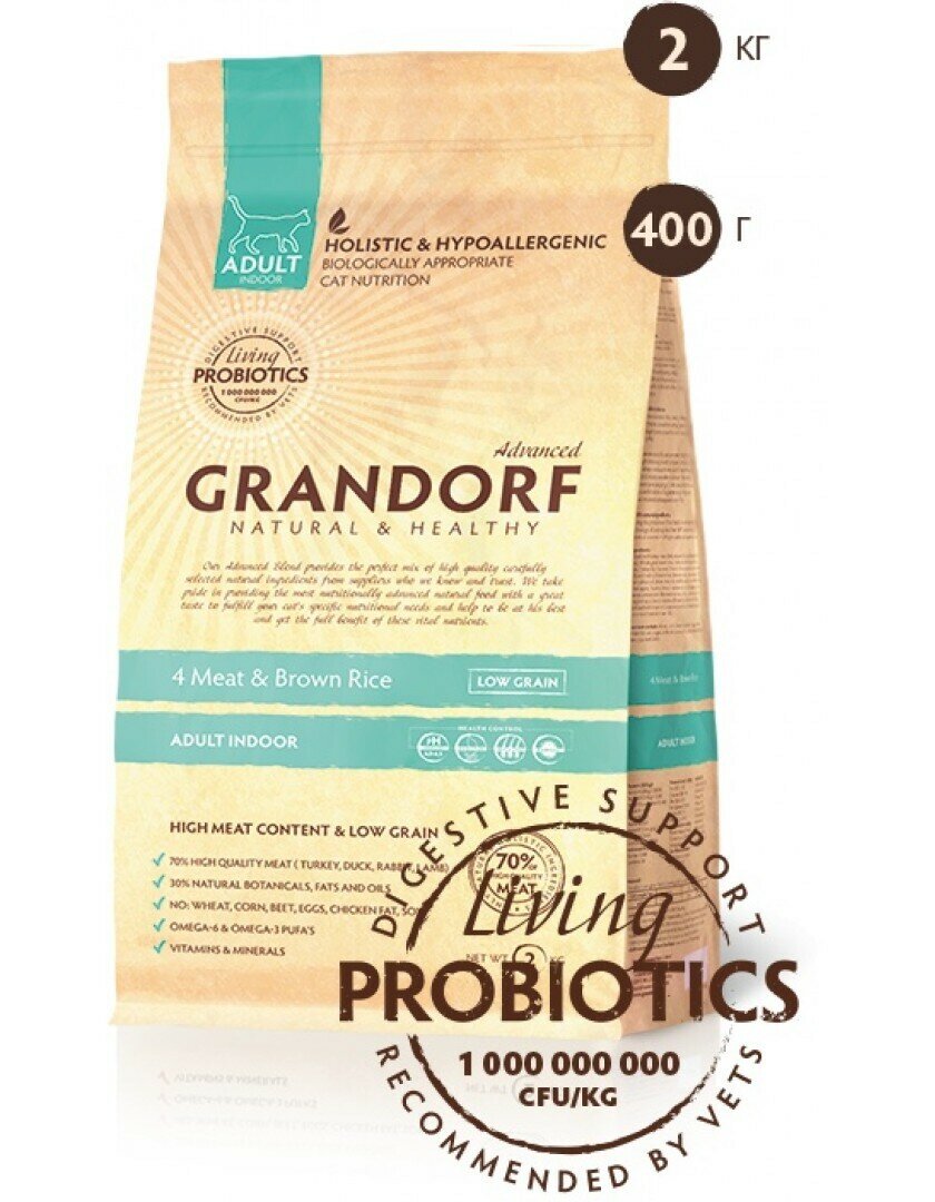 GRANDORF CAT LIVING PROBIOTICS 4 MEAT & RICE STERILISED низкозерновой с живыми пробиотиками для взрослых кастрированных котов и стерилизованных кошек с мясом и рисом (0,4 кг)