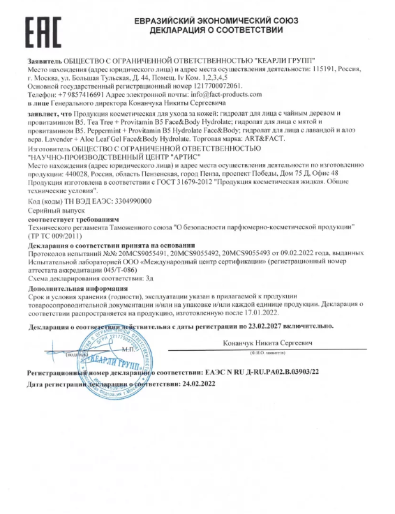 ART&FACT. / Гидролат спрей для кожи лица и тела с чайным деревом и провитамином B5, 50 мл интересное: