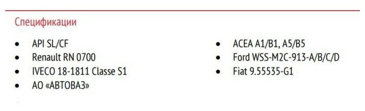 | Допуски OEM | Iveco / Renault RN 0700 / FIAT 9.55535-G1 / Ford WSS-M2C-913-A/B/C/D |