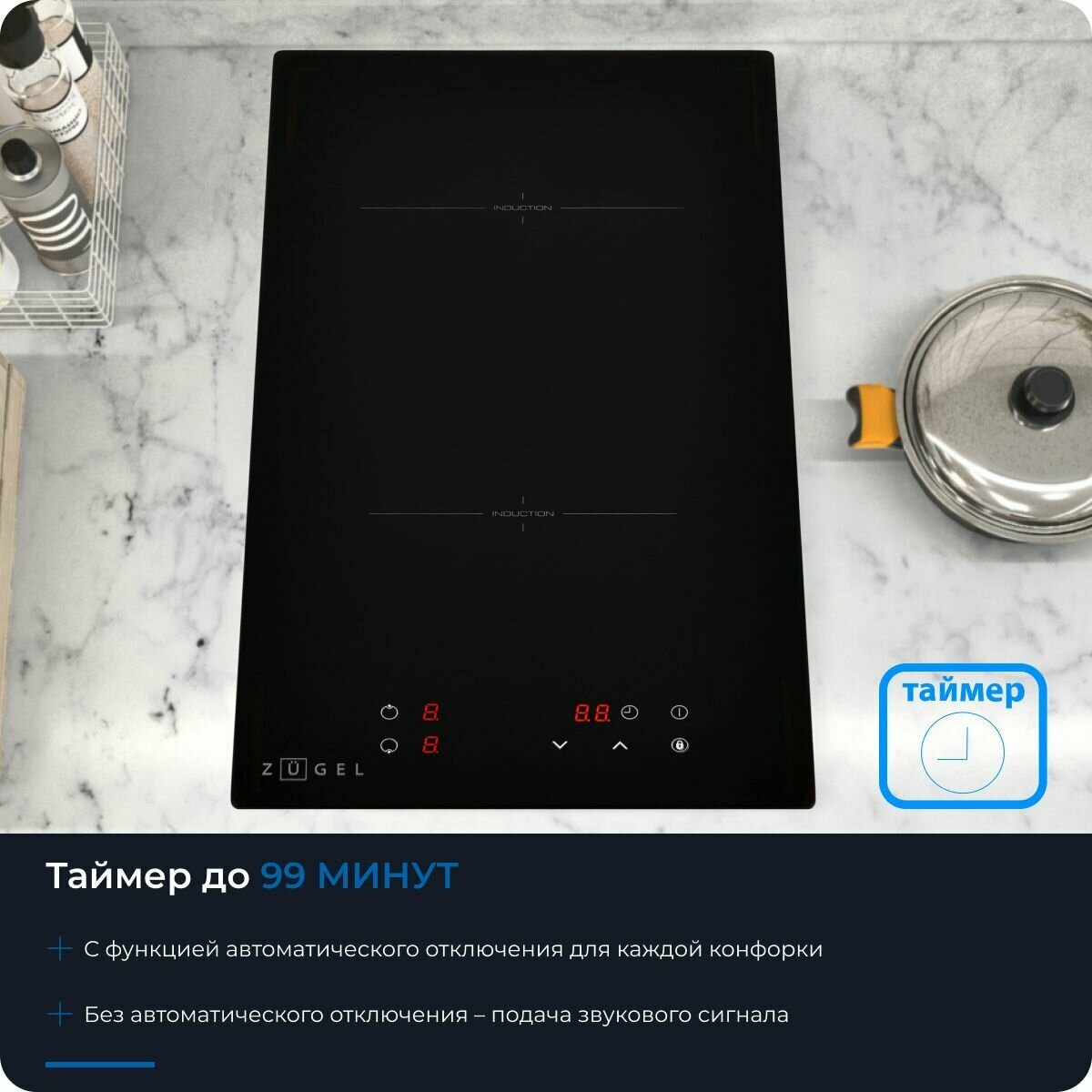 Индукционная варочная панель ZUGEL ZIH293B, сенсорное управление, 9 уровней мощности, 3500 Вт, сенсор наличия посуды, таймер, черный