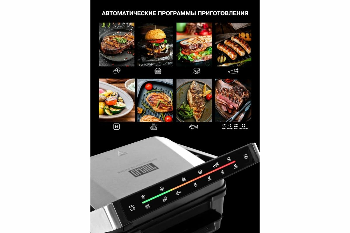 СохранитьGFGRIL Электрический гриль GFGRIL GF-1500, съемные панели, сенсорное управление, 7 программ, 4 степени прожарки / компактный электрогриль GF-1500 интересное: